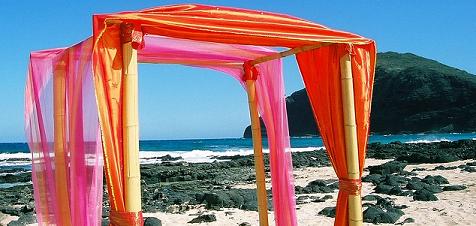 The flowers of Hawaii are fantastic and colorful. There are hibiscus in a rainbow of colors, and Plumeria or Birds of Paradise make fabulous flower choices as well. Choosing your wedding flowers is always a great place to start, when decorating for your wedding. Bridesmaids can carry a single stem of Ginger Flower. Not only will it make a dramatic statement, the gorgeous and elegant flowers are fairly inexpensive, especially compared with the cost of a large bouquet. Antherium flowers make a great addition to wedding centerpieces, and aisle decorations. These waxy flowers look more like fancy leaves than anything, and they come in cool tropical colors like chartreuse, pink, red and ivory. Add lots of thai leaves or palm fronds to make your arrangements fuller and to add contrast. Even if you've never been to Hawaii you can pull off this Hawaiian wedding theme.
